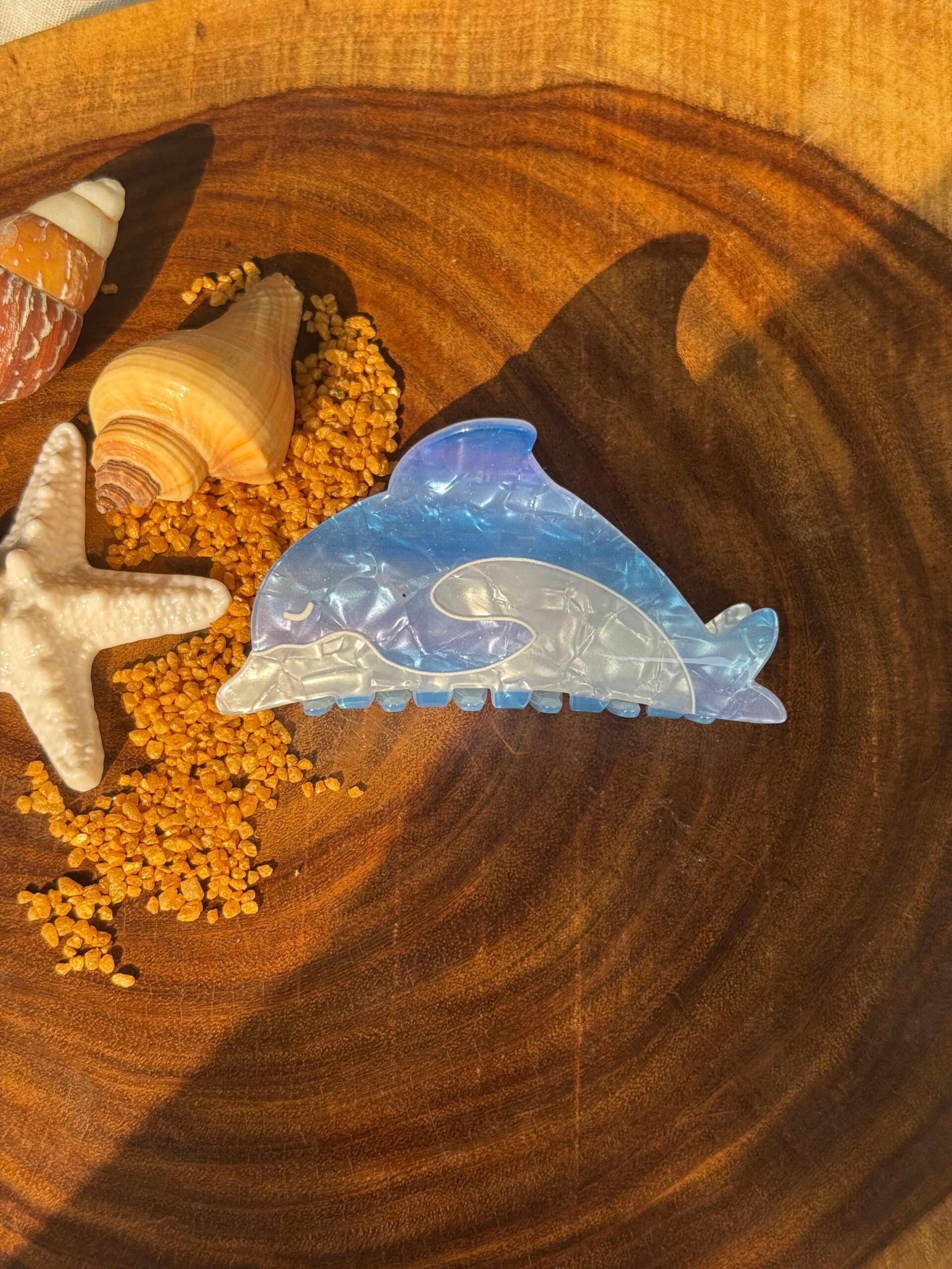 Dolphin-shaped acrylic hair claw ๐ฌ๐ with strong grip and ocean aesthetic.