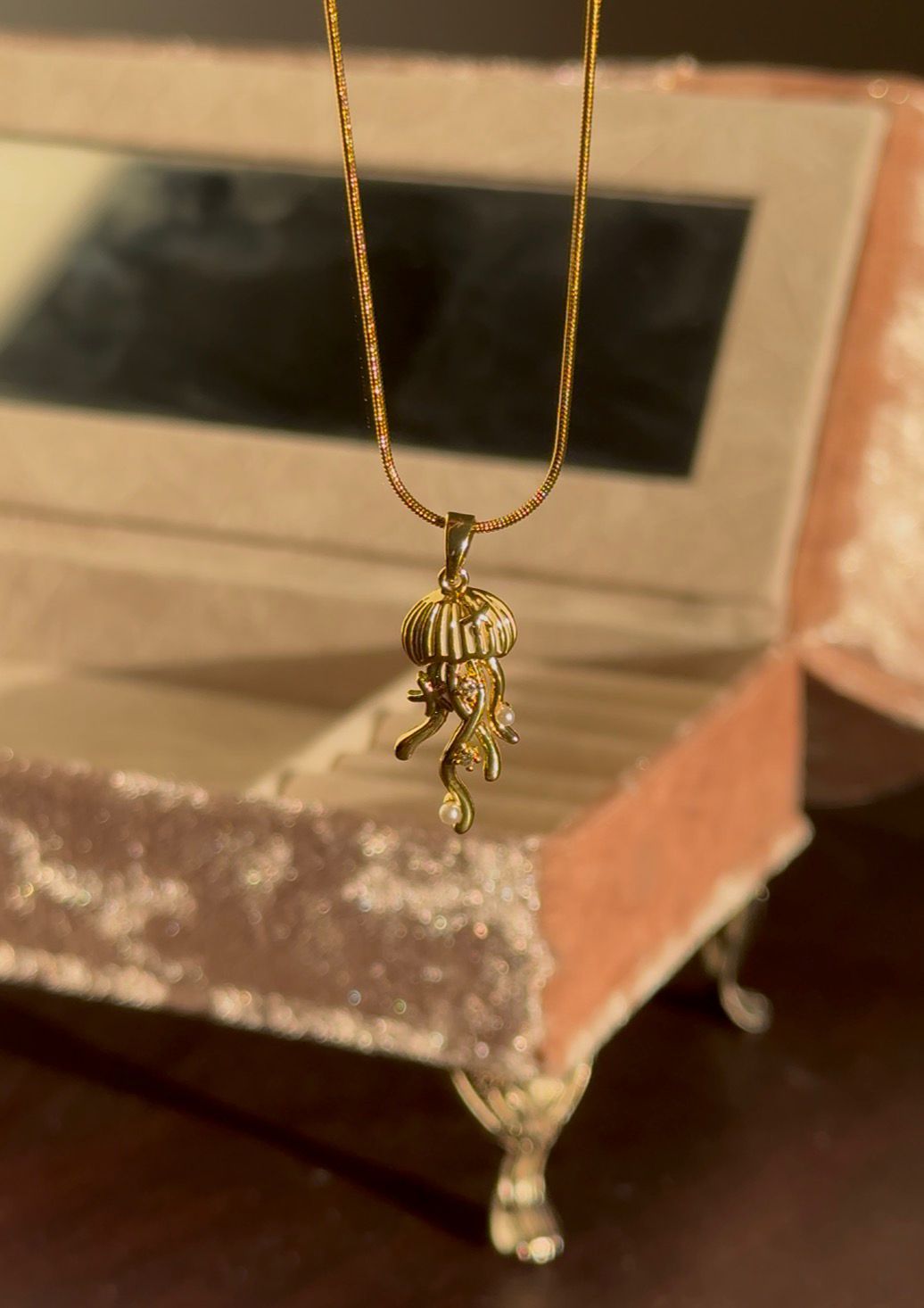 Soft gold jellyfish pendant with subtle stone work — anti-tarnish finish.