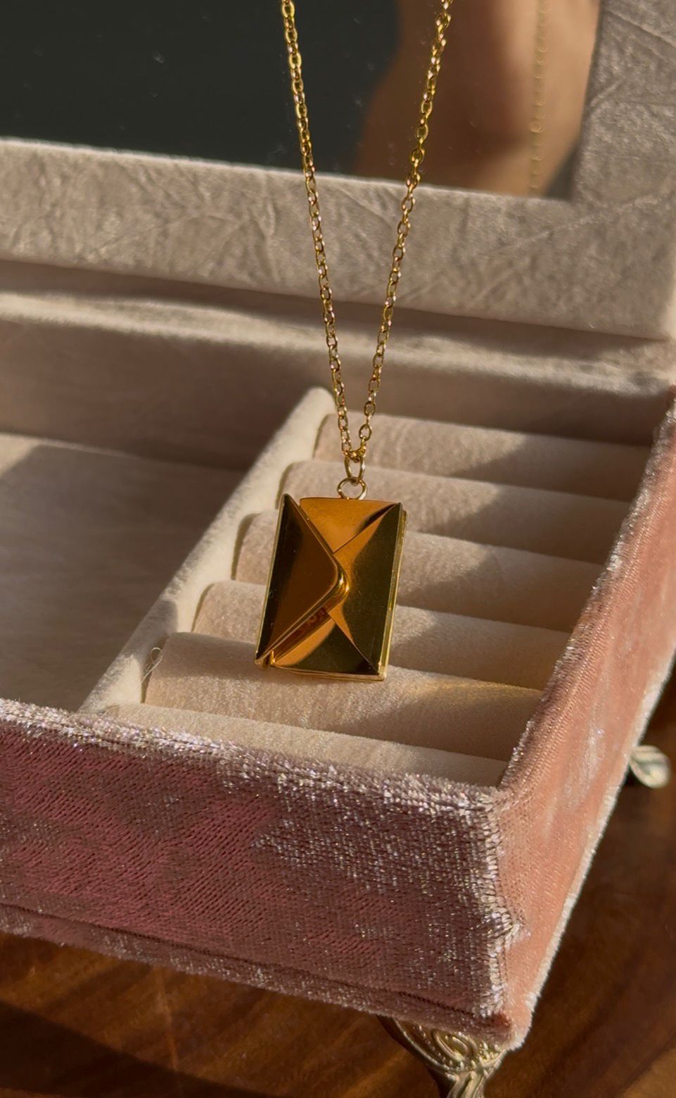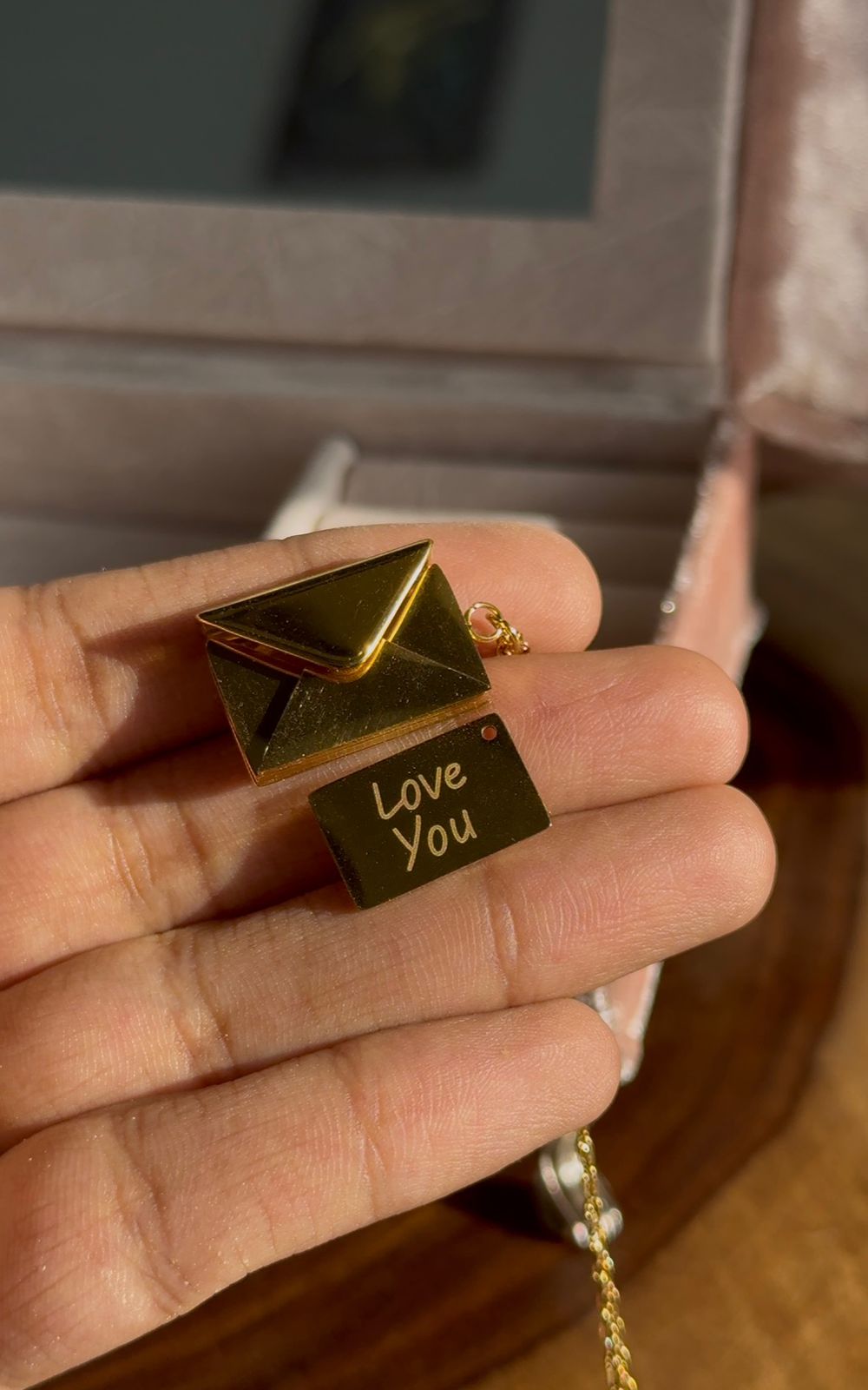 A timeless keepsake — the Love Letter Locket 💌 opens up to reveal a tiny golden note engraved with “Love You.” This openable envelope design adds a romantic, personal touch to any look.
