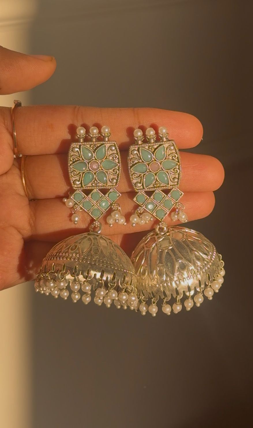 Pure oxidised jhumka 🌿✨ with mint floral design & pearl detailing — elegant, lightweight & desi chic
