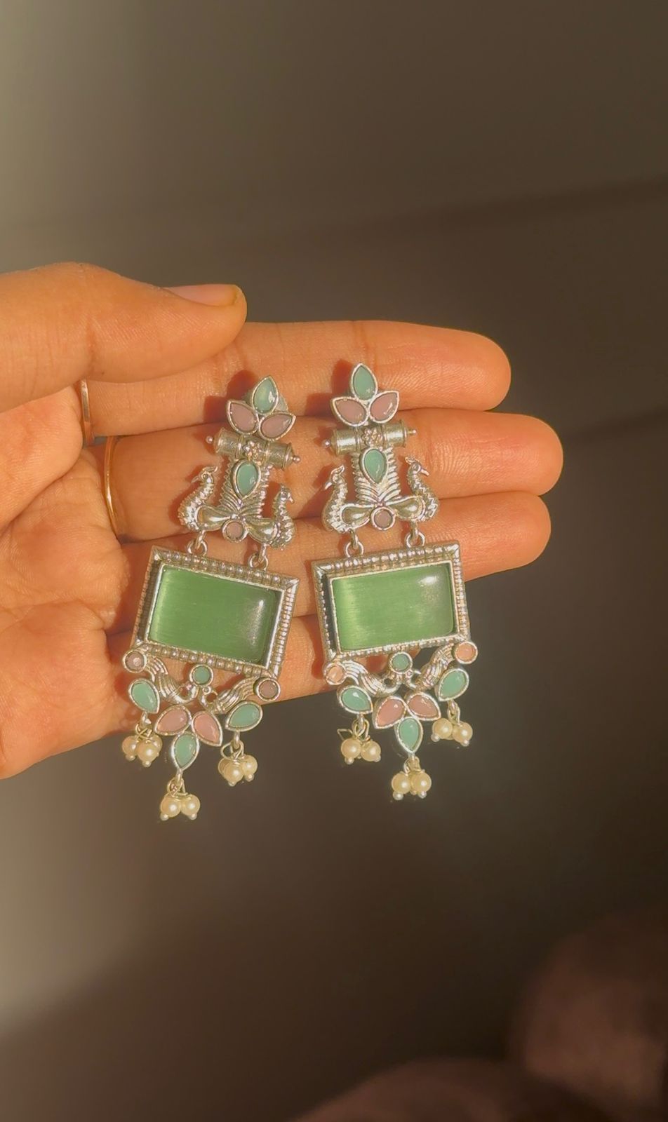 Elegant oxidised silver earrings with mint & blush enamel and pearl accents โ regal, graceful, and festive-ready ๐โจ