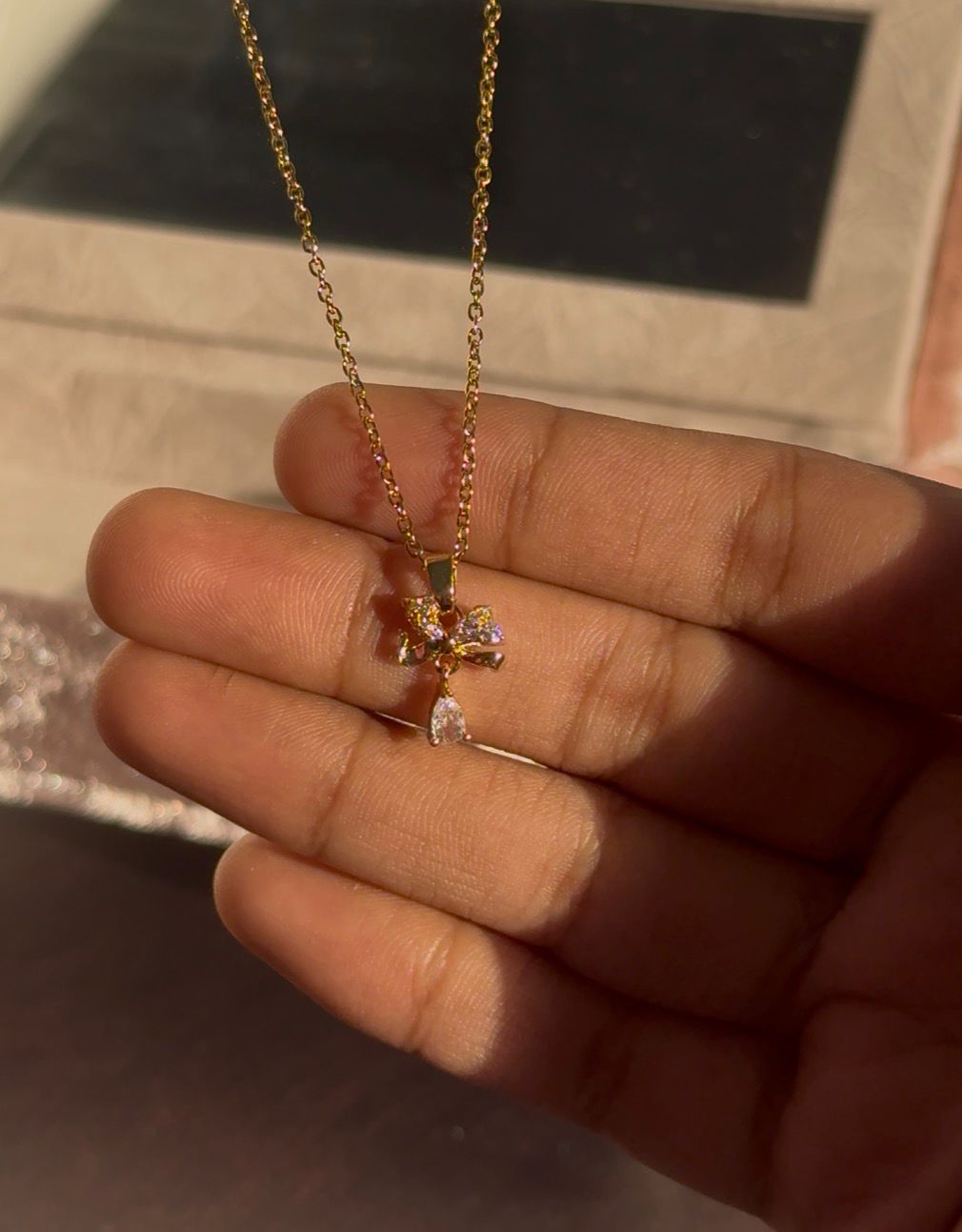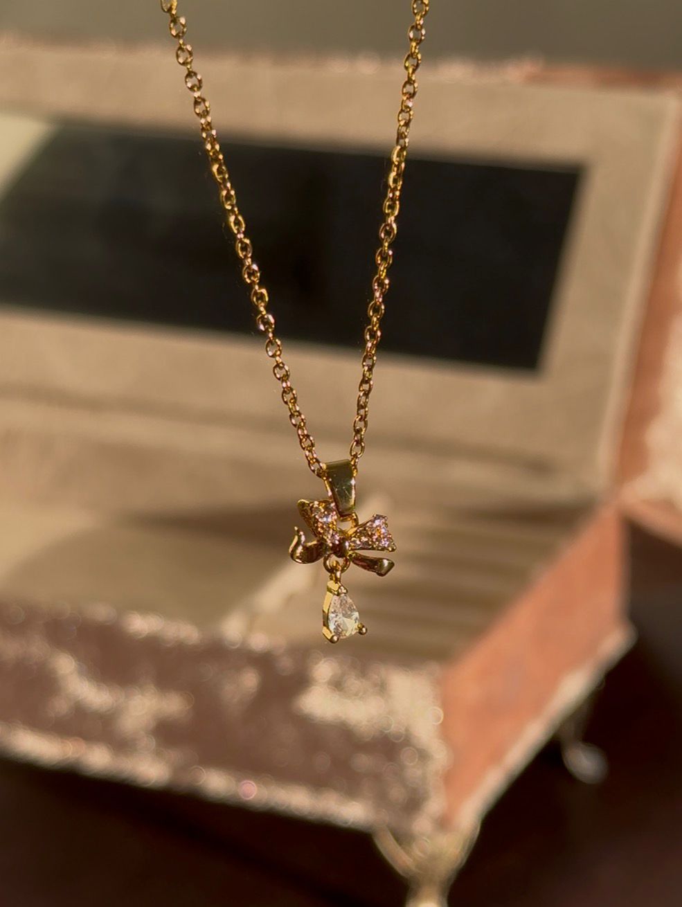Golden bow pendant with crystal drop โ anti-tarnish finish.