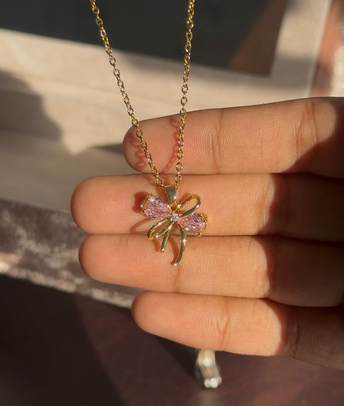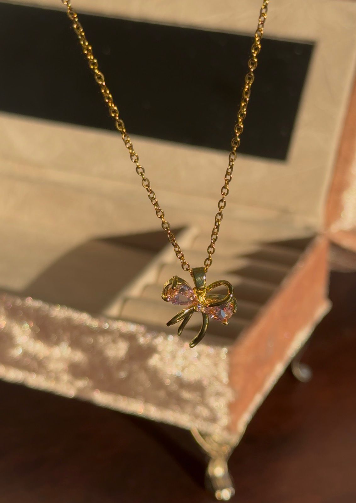 Golden bow pendant with sparkle stones โ anti-tarnish finish.